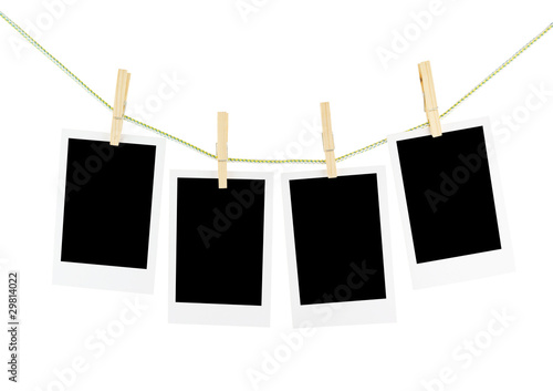 Photos and wooden clothespins isolated on white
