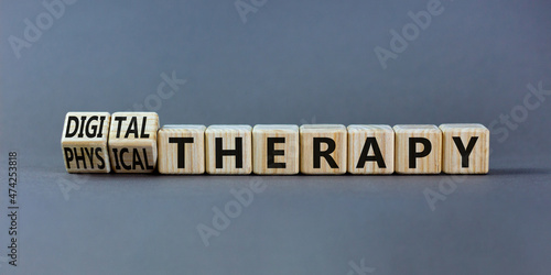 Physical or digital therapy symbol. Turned wooden cubes and changed words physical therapy to digital therapy. Beautiful grey background. Medical, physical or digital therapy concept. Copy space.