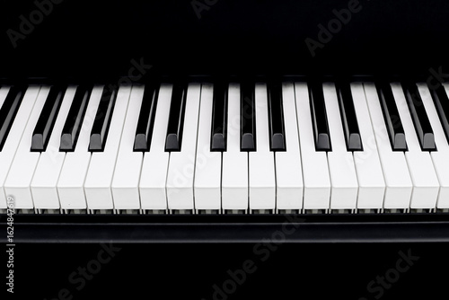 Piano keys closeup. Black and white keyboard detail. Classical musical instrument in studio lighting. Horizontal composition of piano keys. Elegant view for music education or artistic concept.