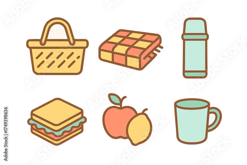 Picnic essentials set featuring basket, blanket, thermos, sandwich, fruit, and mug icons