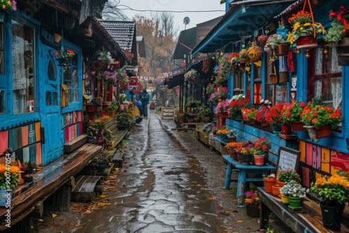 Picturesque village street with colorful decor, cheerful and lively ambiance, bright and inviting setting, rustic charm, joyful street scene, vibrant colors, cozy village atmosphere.