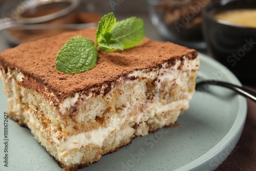 Piece of tasty tiramisu with fresh mint on table, closeup