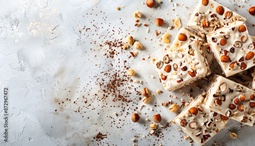 Pieces of delicious nutty nougat on light gray table, top view. Space for text