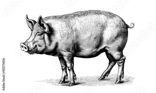 Pig, hog, boar. Vintage retro print, black white pig sketch ink pencil style drawing, linear drawing, engrave old school. Sketch artwork silhouette pig, hog, boar. Side view profile. Illustration
