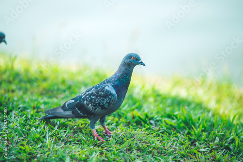 Pigeons are walking for food on grass.