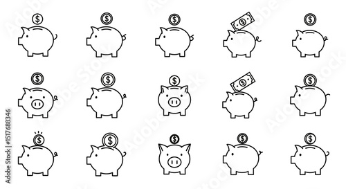 Piggy Bank Savings Icons 15 Line Art Illustrations for Financial Projects