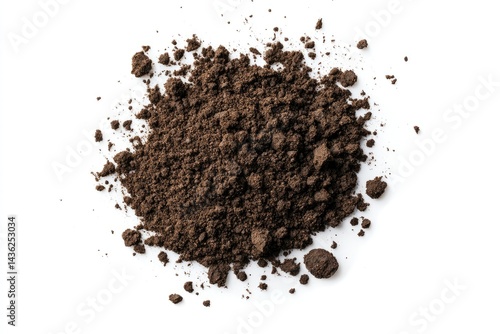 Pile of dark brown soil. Small clumps and particles