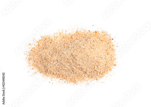 Pile of fresh bread crumbs isolated on white, top view