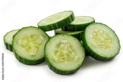 Pile of freshly cut cucumber slices isolated on a clean white background