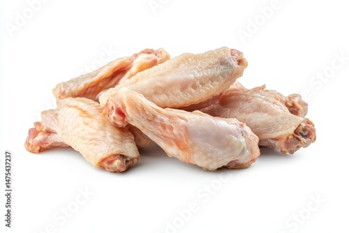 Pile of raw chicken wings are displayed on a white surface ready for cooking
