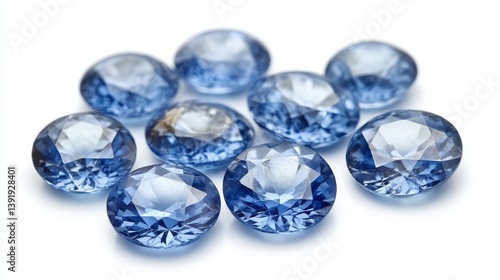 Pile of Ten Round Cut Blue Sapphires on White Background, Isolated Precious Gemstones