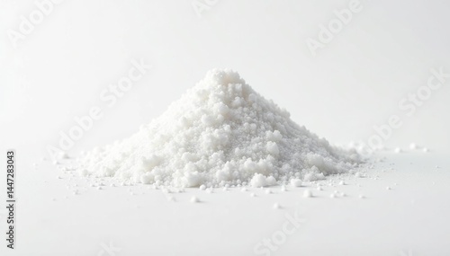 Pile of white granulated sugar on white background, crystalline, ingredient, close-up