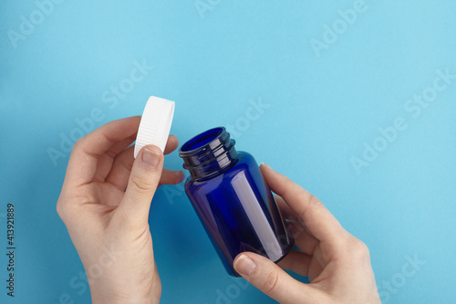 Pills package opened in a hands. Close up pill bottle on blue background. Medicine, medical insurance or pharmacy concept close up with copy space.