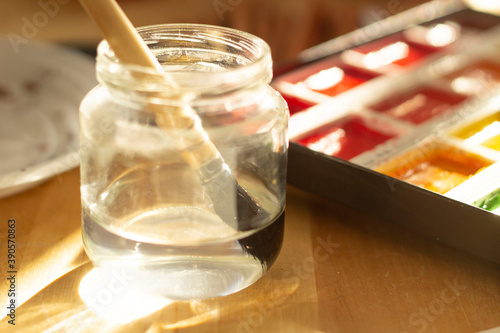 Pinceau dans un pot et boîte d'aquarelle
