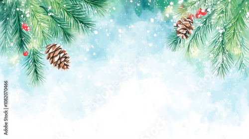 Pine branches and cones on snow create serene winter holiday mood for seasonal designs