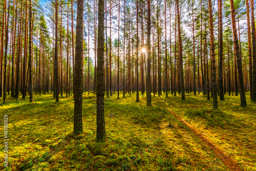 Pine forest in autumn. The path goes deep into the forest. The sun shines through the trees. Moss-covered glade. Sun rays. Beautiful nature. Russia, Europe.