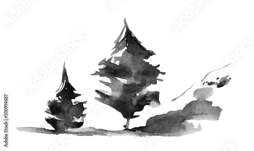 Pine tree stands on the high mountain with cloud sea landscape, ink landscape Chinese painting style.