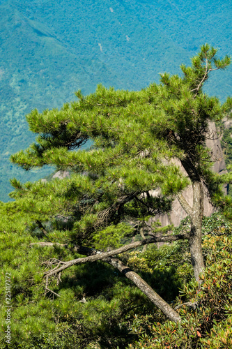 pine trees covered peak under the sun at mount sanqing