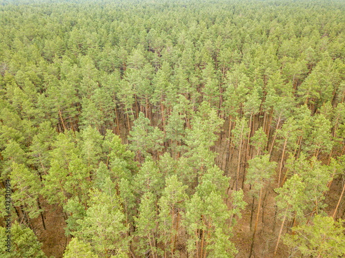 Pine trees in a coniferous forest in early spring. Aerial drone view.