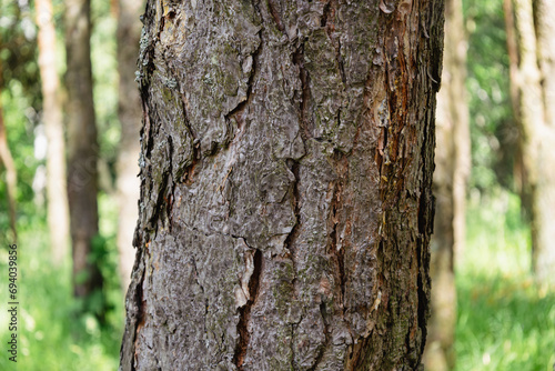 Pine trunk tree in foreground and park in background. Pinus sylvestris. Natural beauty. Scenic forest. Scotch pine or Baltic pine in spring season. Bark of pine family Pinaceae