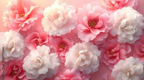 Pink and white peonies in soft light with delicate petals and gentle gradient background