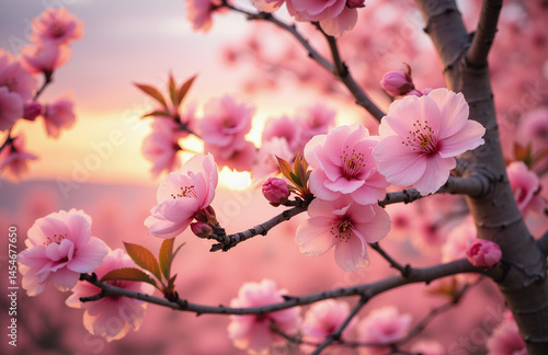 Pink blossoms on tree branch with soft sunset background.