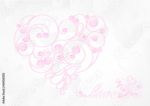 pink calligraphic heart with shadow and love word on the light background horizontal