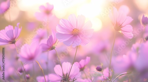 Pink cosmos flowers blooming in garden under soft sunrise light, peaceful spring and summer floral scene