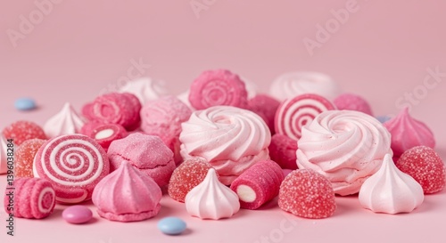 Pink Delight: A Sweet Collection of Confections - A delightful assortment of pink marshmallows, macarons, and gummy candies, perfect for a sweet treat or celebratory occasion