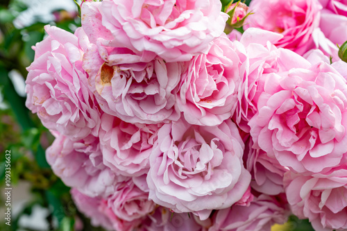 Pink flowers closeup, buds, pink roses in the garden.