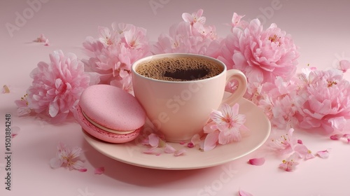 Pink Macaron with Coffee and Flowers