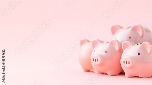 Pink piggy banks arranged in a group on a pink background, symbolizing savings and financial security
