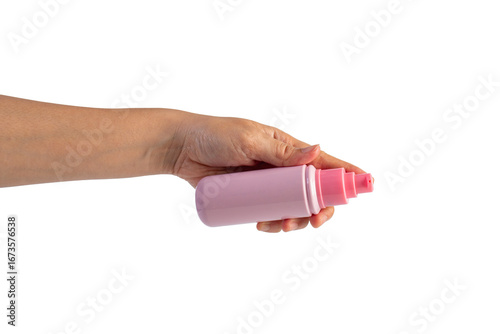 Pink product bottle in hand on transparent background