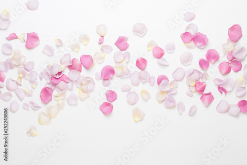 Pink rose flowers petals on white background. Flat lay, top view, copy space.