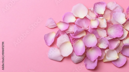 Pink rose petals scattered on a light pink surface for decoration or craft