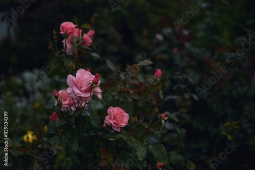 Pink roses with water droplets and green foliage in a moody garden setting during daylight.