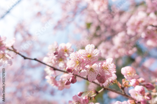 Pink sakura flower bloom in spring season. Vintage sweet cherry blossom soft tone texture background.