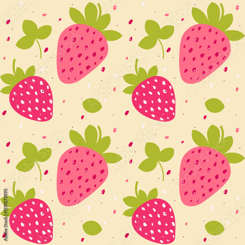 Pink strawberries with green leaves on a light background. Seamless pattern.