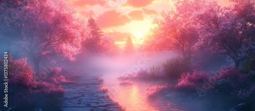 Pink Sunrise Misty Forest Stream