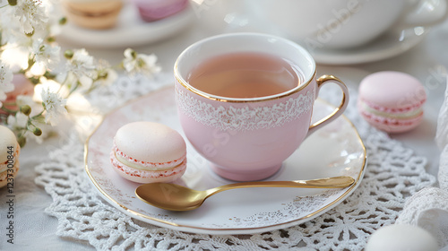 Pink teacup and macarons on a lace doily, a delicate and sweet afternoon tea scene.