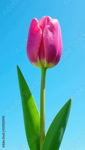 Pink tulip stem with green leaves against a clear blue sky, flower, tree