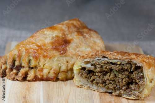 Piroggen mit Hackfleisch gefüllt auf Holzbrett