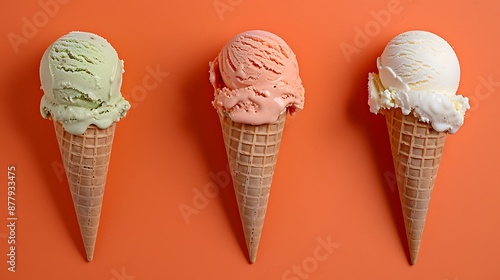 Pistachio chocolate strawberry and vanilla ice cream in a cone on orange background