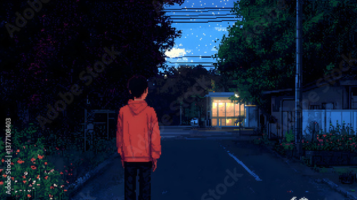 Pixel Art of a Man Walking Down a Dark Street at Night with Trees and a Lit Building Under a Starry Sky