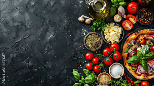 Pizza ingredients and spices for cooking mushrooms, tomatoes, cheese, onion, oil, pepper, salt, basil, olive and delicious italian pizza on black concrete background. Copyspace. Top view. Banner