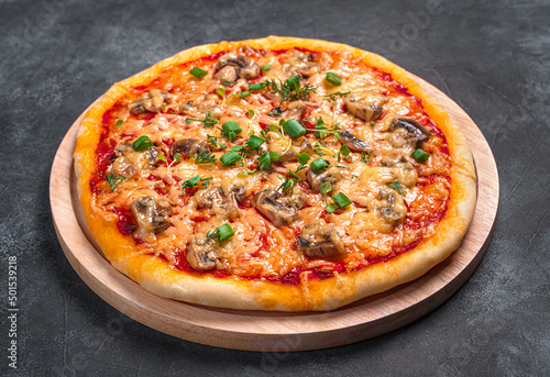 Pizza with mushrooms, cheese, tomatoes and herbs on a cutting board on a dark background. Fast food. Side view, close-up.