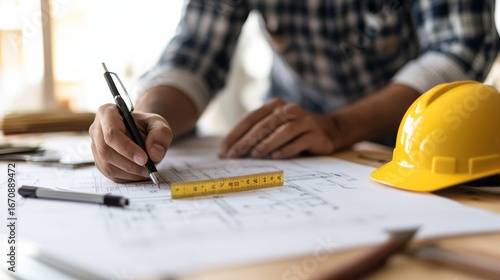 Planning and designing architecture projects office space workstation blueprint construction environment close-up view creative process