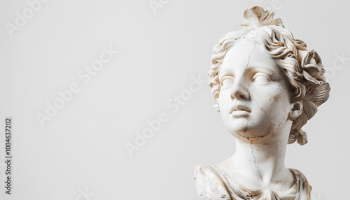 plaster head of an antique girl stands on a pedestal on a white background