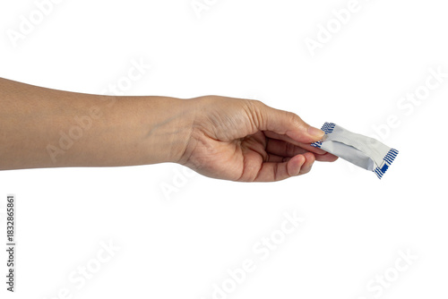 Plastic bag snack packaging and hand holding isolated on transparent background