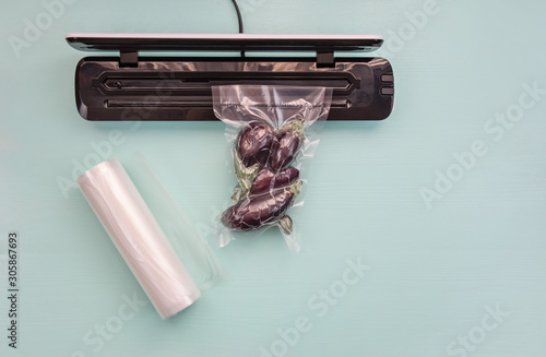 Plastic sealing machine. Vacuum packaging of fresh tomatoes. Vacuum packaging fresh eggplant for storage.